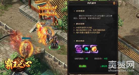 闯天关中的每一关中都有一个BOSS镇守,玩家需在3分钟内击杀BOSS,击杀后即为挑战成功,可选择进入下一关;若在3分钟内未能击杀BOSS,则为失败,玩家将被传出副本。