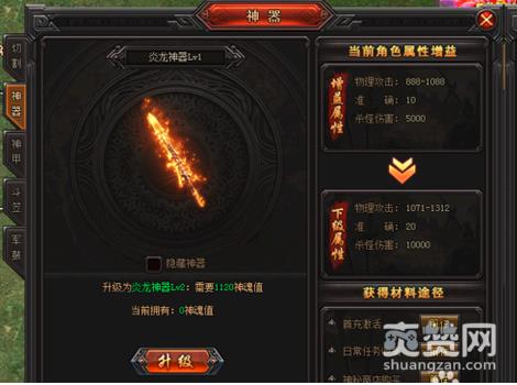 神器功能包括:切割、神器、神甲、斗笠、军鼓。切割:能提升切割概率和切割伤害;斗笠、军鼓:升级可获得大量属性;而神器、神甲:可以获得海量属性加成,并且具有炫酷外观,可以通过神魂升级,神魂完成日常收集任务可以获得。
