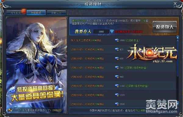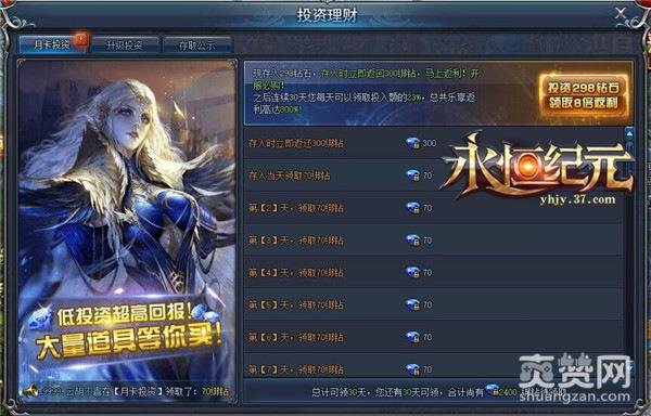 俗话说:你不理财,财不理你!在游戏中也一样,找对方法,可让你花少钱也能成为大神,37《永恒纪元》页游版投资理财系统分为月卡投资和升级投资,投资后将会获得高额绑钻返回,玩家们使用绑钻能在绑钻商城购买投资的钻石,而投资理财将会把所有投资的钻石全部转化为高额绑钻。