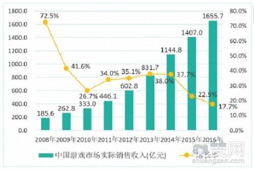日前,一年一度的中国游戏产业年会在海口举行,本次年会发布了《2016年中国游戏产业报告》。整体游戏产业稳步增长,但页游出现负增长。产业调查数据显示,2016年国内游戏市场实现销售收入1655.7亿元,同比增长近250亿元,增长率为17.7%。移动游戏实现销售收入819.2亿元,同比增长59.2%,继续保持高速增长。相比之下,网页游戏并没有取得增长的成绩。网页游戏营销收入187.1亿元,同比下降14.8%。传统游戏形态首次出现负增长,引起了很多业内人士的关注