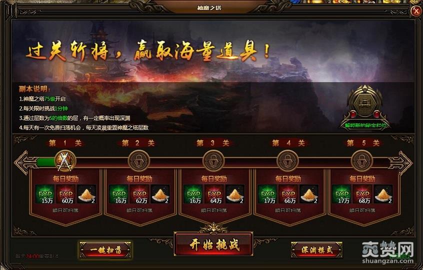 第1关:角色经验*15万,英雄经验*60万,秘宝粉尘*2。