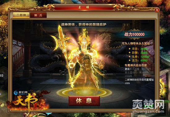 在哥们网《天书世界》兵神附体,可以为角色带来额外的兵神属性等,而且玩家还可以为兵神穿戴武器,破阵兵神八卦等。