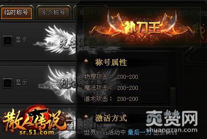 以证明你是游戏中手最快、伤害最高的玩家的称号是“最强补刀王”,这个称号可以在51《散人传说》世界BOSS活动中获得!51《散人传说》世界BOSS活动只有10分钟,在在这10分钟击败世界BOSS几率掉落转生装备,厉害的是:世界BOSS所掉落的装备是无归属的,拼手速的时刻到啦!先到先得哈!而且在活动中给予世界BOSS最后一刀的玩家还可获得霸气无比的补刀王称号!