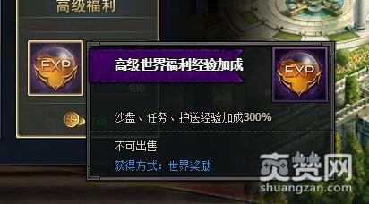 高级世界福利经验加成:沙盘、任务、护送经验加成300%。