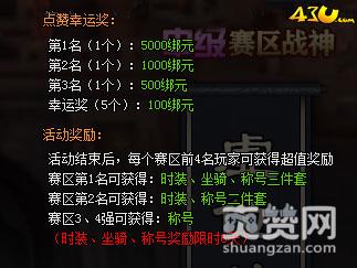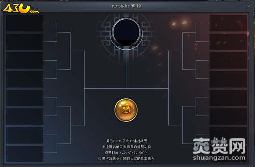 在决赛名单产生后,玩家还可以参战双方点赞。点赞时间只有3分钟,每点赞一次就可获得一个点赞礼包,点赞次数用完后,之后每次点赞需消耗10元宝,每点赞一次,获得一个抽选机会,点赞次数越多,中奖率越大。活动结束后,会从胜方玩家中抽取幸运玩家,给予丰厚奖励。