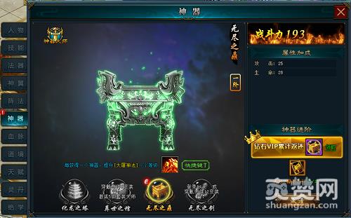 天符大帝用他无尽的伟力,将自身的大屠神法与这些神器结合起来,每获得一个神器,就能提升一级大屠神法的等级。化龙之塔:一步化龙,极大的增加体魄;葬世之棺:世界葬送都不会湮灭的天棺,极大的增加防御力;无尽之鼎:无尽之鼎演天地造化,无孔不如,无物不破,极大的增加攻击力;无尽之剑:相传与无尽之鼎双生,极大的增加暴击和暴击伤害。