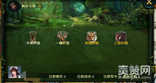 狩猎森林拥有野鸡、兔子、鹿、野猪、老虎还有熊等大大小小五六种动物。射杀每一种猎物都可以获得相应的资源,其中射杀野鸡和野猪可以获得军功,射杀兔子、鹿还有老虎能够得到银币,而杀死凶猛的大狗熊更是可以得到价值20金币的军令。