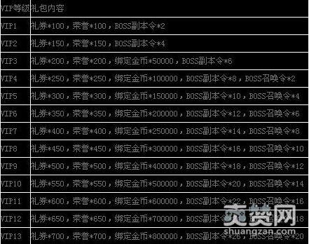 到了VIP3礼包,礼包中就多了一样绑定金币领取。而从VIP4开始,则多了BOSS召唤令。随着VIP等级的提升,礼包内容的数量也慢慢递增。到了最高级的VIP15,更是可以获得礼券*800,荣誉*800,绑定金币1000000、BOSS副本令*30和BOSS召唤令*24。