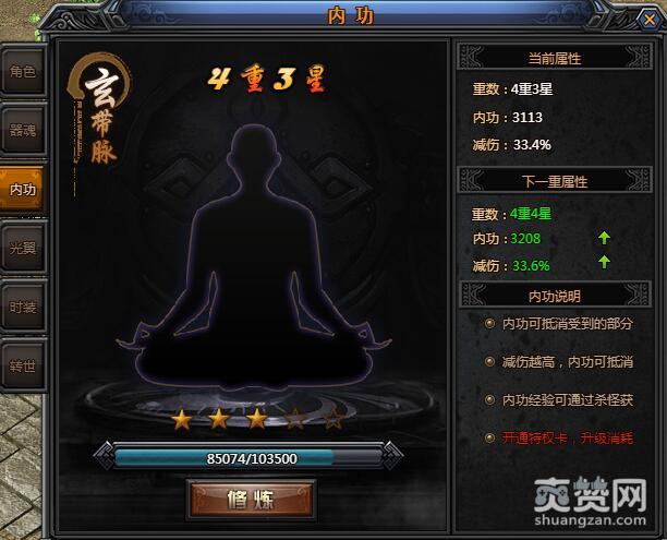内功经验可一直累积,经验条满后需要手动点击升级按钮才能进行提升。