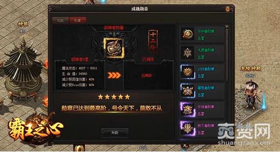 《霸王之心》的成就分支下,总共可达成成就多达千种以上,每种成就均可获得成就点与金币奖励。通过积累成就点,可以提升玩家的勋章等级,目前版本中勋章共有十二阶,每阶分为五星,升级勋章后可以大幅提高玩家的攻击力、生命值,减少受到玩家、BOSS伤害等等。成就与勋章的成长都是终身有效,永不消退!