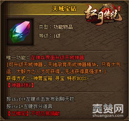 神兵成长需要的物品,也没平淡之物,而是需要传说中的天地孕育的神器精华天域宝钻,此物需有大气运,大毅力之人才方可获得!当锻造到神兵之上,神兵便会泛起耀眼的光芒,天空七彩祥云涌动~天域神钻的获得方式也不单一,可以通过神臂宝箱 特权BOSS 寻宝等方式获得哦~