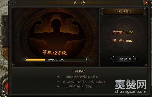 玩家击杀小怪、BOSS,都可获得萝卜玩《传奇霸业》内功经验的奖励,使用内功经验提升内功等级,便可提升减伤比例,让“金钟罩”、“铁布衫”不再是遥不可及的武林神话!