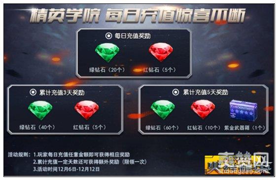 火线精英12月全新特惠活动开始啦!只需充值任意金额 即可获得相应天数的超值额外奖励!活动期间内每天充值都可以可获得绿钻石血钻石多达25颗!在累积到达3天的时候,还能额外再得到45颗钻石,结合原本的25颗,当天一天即可获得70颗钻石哟!!累积充值5天的时候,当天不仅能获得95颗钻石,同时还能额外再得紫金武器箱~惊喜1元起!心动就赶快心动吧!