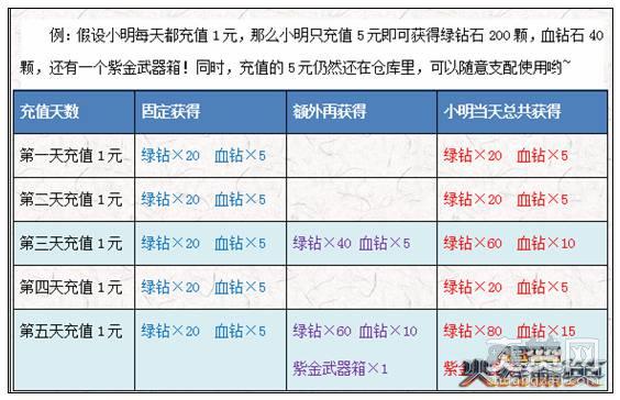 累积第五日额外获得:绿钻石×60 血钻石×10 紫金武器箱×1