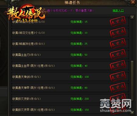 关于51《散人传说》神魂的获取方式,这里有着最详尽的记载。每日可以通过多达20个以上的任务来兑换神魂,比如:收集1转首饰任意3件可以兑换神魂15个、收集1转符文任意3个可兑换神魂10个…收集通天神甲(男女)任意1件可兑换神魂80个,越到后面的任务也就越具挑战性,同理获得的神魂的个数将非常高。