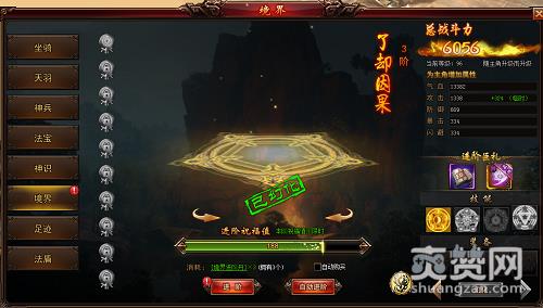 玩家点击游戏画面界面右下角“坐骑”进入“境界”画面。境界使用境界进阶丹进行进阶,境界一共有12阶,每成功升阶一次都会发生外观上的变化并带来更强大的属性加成,阶数越高属性加成越高。