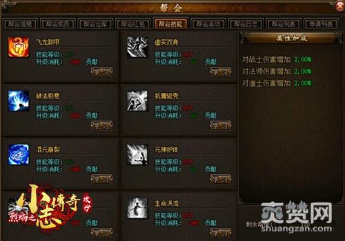 玩家加入到9377小志传奇帮会之后,再进入到帮会界面里,就可以找到帮会技能界面。大家可在该界面里,去学习你喜欢的一些帮会技能。目前,9377小志传奇帮会技能共有8项,分别有肥龙卸甲、虚实双身、破法极意、抗魔躯壳、混元崩裂、元神护体、韧性提升、生命洪流。各种帮会技能会存在不一样的效果呢~