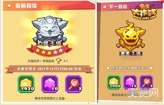《4399宝宝大作战》作为一款休闲竞技类游戏,采取段位模式以区分玩家对该游戏的操作水平。段位一共六个段位,分别为:青铜、白银、黄金、铂金、钻石、传说。而每个段位划分三个级别(“传说”段位除外,以“白银”段位为例:白银1级、白银2级、白银3级)。每个级别都有五个星级,必须满五个星级才能晋升下个级别。赛季结束后,每个段位每个级别的奖励都是不一样,段位级别越高,奖励也会随之越丰厚。