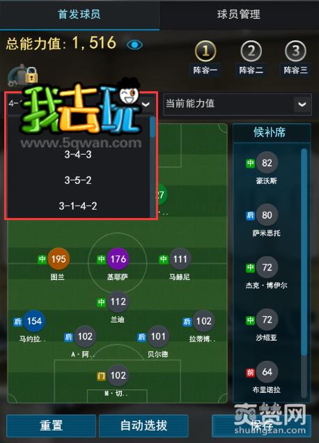 玩家通过T`1联赛的第8关后,便可以解锁球队阵型玩法。针对不同球员使用不同阵容,可以让球员的能力得到充分的发挥。玩家可以在阵容系统中设置阵型。阵型的设置非常简单,玩家进入首发球员的界面后,可以看到绿色区域上方左侧有一排数字,这表示的是当前球队的排列组合,点击下拉的按钮后,玩家还可以看到其他的排列组合。每一个排列组合表示一个阵型,玩家可通过更改排列选项来更改球队的阵型。选完之后再点击保存按钮所选阵型将会自动生效。