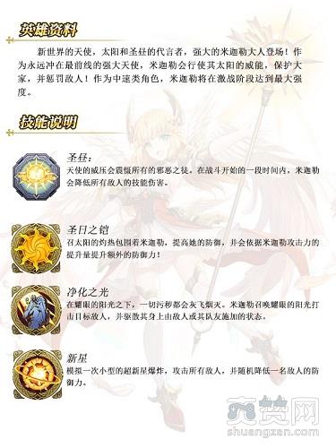 米迦勒虽然是激战阶段才会达到最大强度的中速英雄,但其被动技能圣昼在战斗开始的一段时间内即会降低所有敌人的技能伤害,有助于米迦勒在开局阶段保存实力。一技能圣日之铠会提高她的防御,并会依据米迦勒攻击力的提升量提升额外的防御力。二技能净化之光不仅能召唤耀眼的阳光打击目标敌人,更能驱散目标身上被施加的buff。三技能新星可以攻击敌方全体,并随机降低一名敌人的防御力。