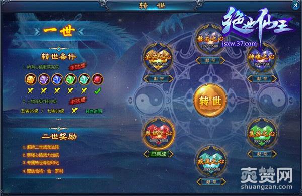 在37《绝世仙王》中,当玩家达到条件后,将会开启转世系统,玩家可通过游戏主界面底部的【转世】图标,进入转世系统界面。在转世界面,玩家可以清楚地看到自己是否符合转世条件,以及转世后能获得的奖励。
