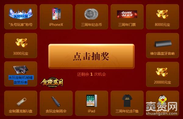玩家每天参与活动,就有机会免费领好礼!我们为你准备了丰厚的大礼,iPhoneX、iPad、贪玩定制机械键盘鼠标套、三周年门票等,就等你来抽奖。并且每个玩家每天都有一次免费的抽奖次数,每天参与“我上我也行”和“战斗宣言”还能额外获得一次抽奖机会,你还在等什么?