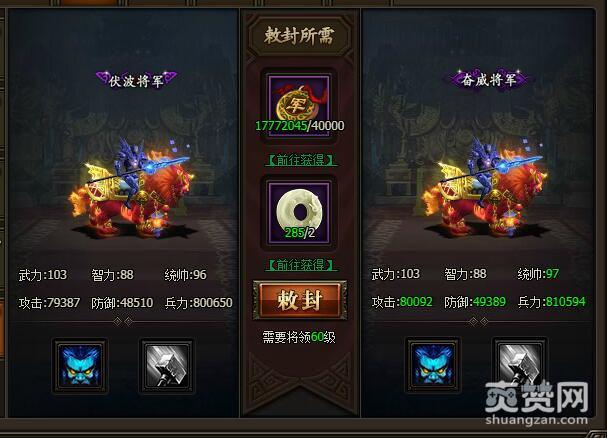 从伏波将军到奋威将军 敕封所需军功40000,美玉2个,需要将领60级