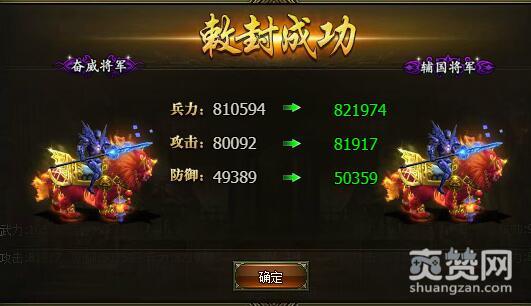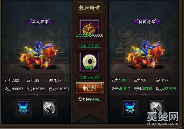 从奋威将军到辅国将军 敕封所需军功60000,美玉4个,需要将领60级