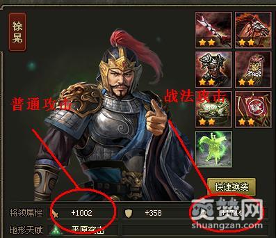 换装备后可以直观的看到普通攻击和战法攻击的变化。洗一套强壮lv 6 (就是两个 lv 3)的装备给徐晃,夏侯惇,前去征服那些拦路虎吧。