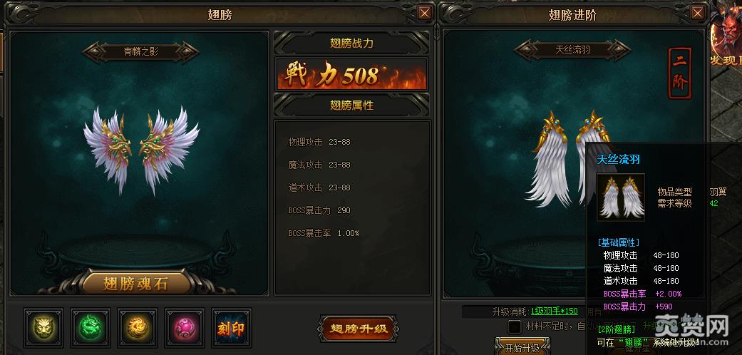 激活翅膀可获得物理攻击、魔法攻击、道术攻击、抗暴几率、抗暴击能力属性