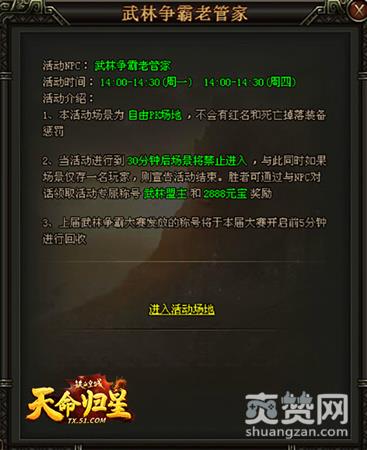 《铁血皇城》武林争霸活动每周一、周四14:00-14:30各举行一次,各路豪杰齐聚一堂,对这武林盟主的宝座可是虎视眈眈。活动限制了80级以上的玩家才能参与,并且活动开始30分钟后是不允许进入的,一定程度上提高了竞技水平,让玩家能够有更爽快刺激的pk体验,同时在活动场地内pk不会出现红名和死亡掉装的情况,各位勇士可以放心大胆的在场地内厮杀,唯一需要顾虑的就是恶意组团,而不需要担心装备问题了。