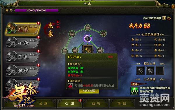 在37《寻秦记》中,每个心法都由众多节点组成,节点又分为真气节点与砭石节点。玩家激活心法后,可以使用真气或砭石注入各节点,每次节点升级都会给玩家带来属性加成。
