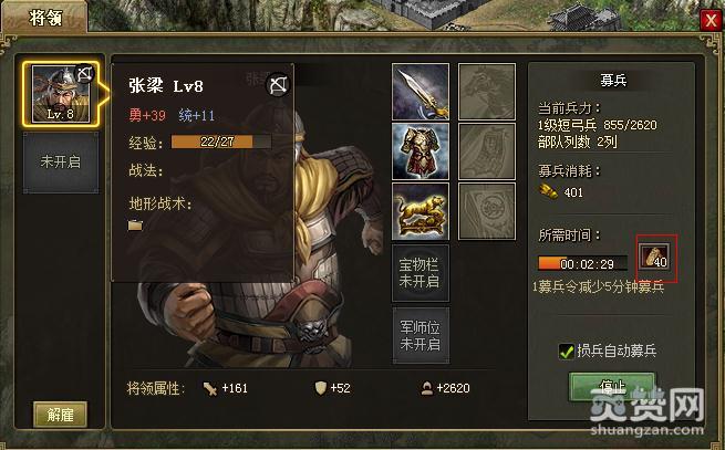 接下来招募士兵之后继续征战,这里可以使用募兵令快速招募。募兵令的作用就是“一个募兵令减少5分钟募兵时间”。