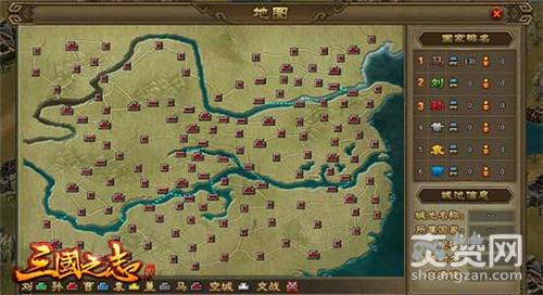 国战开启后的前三天为报名期,报名后玩家将随机被分配到刘备、孙权、曹操、董卓、马腾、袁绍六个势力当中,并在世界地图的随机位置获得一个据点,玩家可以在据点中建造兵营、粮仓、集市三种建筑,召集预备役组建自己的军队后,就可以开始攻打周边的城池。
