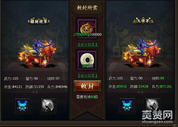 从骠骑将军到大将军 敕封所需军功100000,美玉20个,需要将领60级