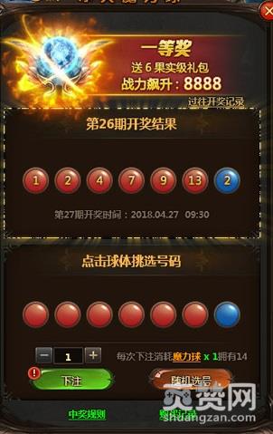 除此之外升级神戒还能获得魔力球和女神碎片礼包,女神碎片可以用来升级女神,消耗魔力球可以进行投注,玩家可自选或随机选取号码进行投注,投中可以获得大量的绑定钻石奖励哦! 开奖时间为:第一次开奖为开服第二天早上9:30,第一次开奖后,每天早上9:30都开奖。奖励多为火球和冰球组合。绑钻奖励说明:一等奖、二等奖、三等奖、四等奖、鼓励奖分别为6级果实礼包*66、5级果实礼包*8、4级果实礼包*8、3级果实礼包*8、级果实礼包*8。