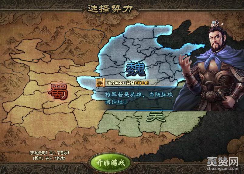 进入游戏之后,首先要选择势力,三国(吴国,蜀国,魏国。)这个就根据自己的喜好进行选择就行了,选择游戏推荐的势力会有额外的金币奖励。接下来点击“开始游戏”,游戏征程正式开始。