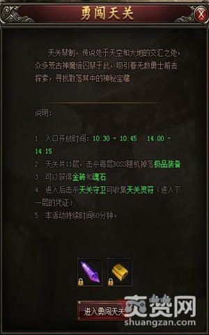 萝卜玩《热血虎卫》天关总共分为9层,每层都有固定的守关Boss,只有拥有足够的“天关灵符”和击杀当前关卡的Boss才能进入下一层,每次进入下一层都能获得闯关奖励,“天关灵符”可以通过击杀当前关卡小怪和精英怪获得,每下一层所需要的“天关灵符”数量都会增加。并且每层Boss都有机会掉落高级装备。