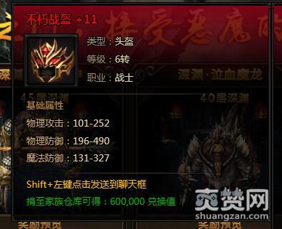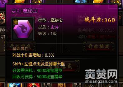 深渊·震天魔神进入时需要消耗神魔深渊挑战书1本。挑战书可以在神魔秘境中刷。掉落的宝物分别是(并不是一定掉,有些宝物是含概率掉落的):穿刺·魔秘宝(史诗)、秘宝精华(中)、BOSS精华(中)、不朽战盔(6转)、不朽战链(6转)、不朽战带(6转)。其中最极品的自然属于穿刺·魔秘宝了。作为品质史诗的魔秘宝,它能在PK时给玩家带来对战士伤害增加0.3%的效果。如果打出实属不易,玩家多多珍惜。