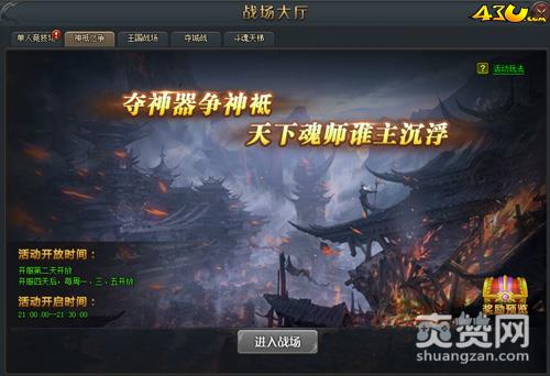在43u《斗罗大陆》中,神袛之争活动会在开服第二天开放、开服四天后,每周一、三、五21:00-21:20开放,在神袛之争中玩家将和其他服务器的玩家一起为神器而厮杀。消灭敌人可获得少量积分,消灭携带神器的敌人可获得大量积分。