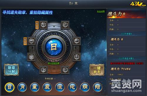 在43u《琅琊榜2》中有日月、星辰、混沌、阴阳勋章,分解这些勋章分别可为玩家带来3、6、10、15点能量。集齐每个字样下所有的勋章就可激活影藏属性加成,大幅提升属性。