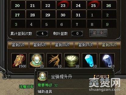 签到大礼包的物品主要有:荣誉、坐骑提升丹、百年人参、百年雪莲、2级防御灵石和2级血魔灵石。每种礼包只是在数量上有区别,当累计签到26天的时候,可获得荣誉*1500、坐骑提升丹*10、百年人参*10、百年雪莲*10、2级防御灵石*10和2级血魔灵石*10。