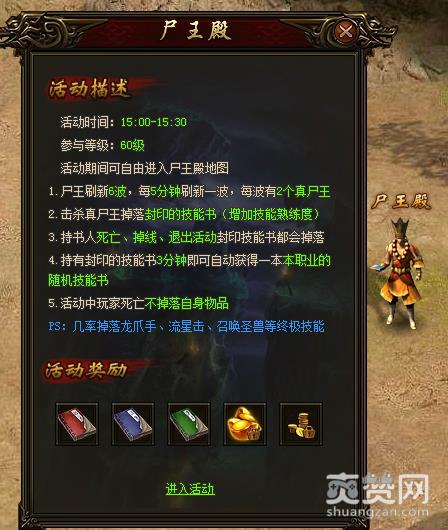 每天的15:00-15:30为52gg《沙城红颜》尸王殿活动开启时间,尸王殿每5分钟会刷新一波,尸王会刷新6波,每波会有两个真尸王!击杀真尸王会掉落封印的技能书,拥有封印的技能书3分钟即可自动获得一本本质有的随机技能书哦!当持书人死亡、掉线、退出活动封印技能书都会掉落,但是玩家自身物品不会掉落哦!