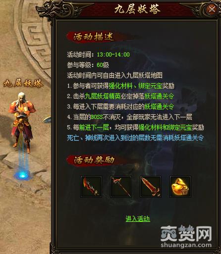 参与就可获得强化材料和绑定元宝奖励的52gg《沙城红颜》九层妖塔小伙伴们一定要去玩一玩哈!在13:00-14:00活动开启时间小伙伴们可以自由进入,只有当层的BOSS被击杀后才可以进入下一层哦!每次进入下一层需要消耗对应的妖塔通关令。每前进下一层都可获得相应的奖励,并且死亡和掉线再次进入到过的层数时无需消耗妖塔通关令的哦!