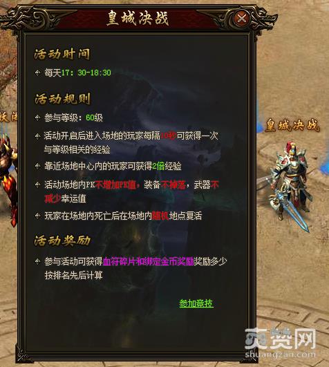 高级羽魄、血符碎片和绑定金币是不是很吸引人呢?那就参与17:15-17:45的皇城决战拥有它们吧!在场地中每隔10秒酒可获得一次和等级相关得经验奖励,活动场地自由PK并且装备不掉落哦!