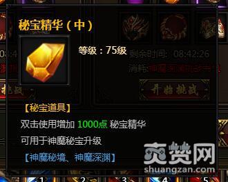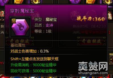 深渊·震天魔神进入时需要消耗神魔深渊挑战书1本。挑战书可以在神魔秘境中刷。掉落的宝物分别是(并不是一定掉,有些宝物是含概率掉落的):穿刺·魔秘宝(史诗)、秘宝精华(中)、BOSS精华(中)、不朽战盔(6转)、不朽战链(6转)、不朽战带(6转)。其中最极品的自然属于穿刺·魔秘宝了。作为品质史诗的魔秘宝,它能在PK时给玩家带来对战士伤害增加0.3%的效果。如果打出实属不易,玩家多多珍惜。