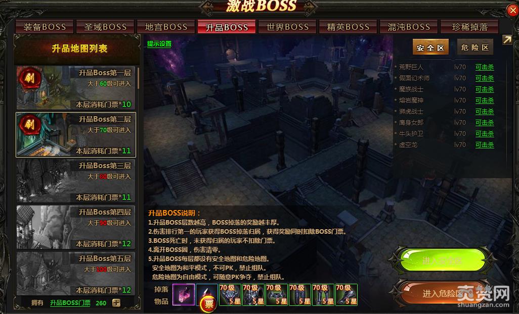 升品BOSS掉落属于伤害排行第一的玩家,BOSS死亡后,获得归属的玩家可以拾取掉落的道具,获得归属的玩家在BOSS死亡后将扣除所需要消耗升品BOSS门票,安全区会刷新炎域烈焰龙、姆多拉、古代树人、三头尖、海洋少女、天空护卫、冰龙、冥界使魔,离开BOSS圈,伤害排行就会清零。
