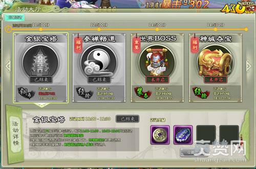 神城打坐可获得大量经验的迷踪珍宝、钦点美女可获得最高奖励的美女护送、击杀财神小怪和财神抢夺其身上财富的仙缘夺宝、财神降临的金银宝塔、抢夺战车摧毁战旗的三界战场、魔族小怪和BOSS随机刷新的魔族入侵等活动都会定时开启哦!小伙伴们只管尽情体验吧!