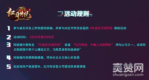 3、短视频中需包含“代表红月消灭你”或者“红月传说,今晚八点我等你”两句口号之一,表现形式包括但不限于口播或文字,当然是越有创意越好啦~