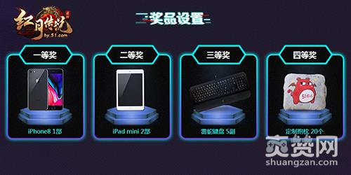 这次的红月传说抖音挑战赛,主办方为大家准备了丰厚的奖品,童叟无欺~一等奖iphone8一部,二等奖iPad mini两部,三等奖雷蛇机械键盘5副,四等奖51游戏定制抱枕被20个。